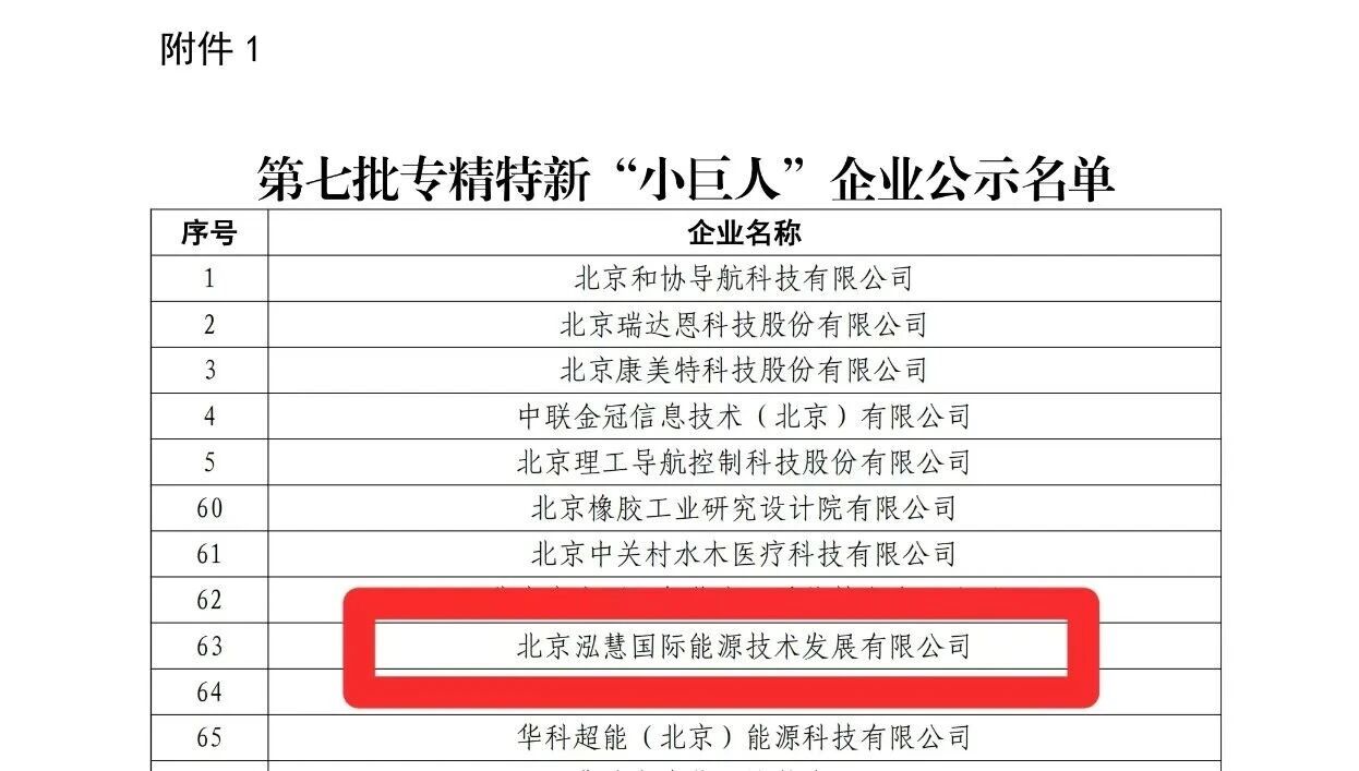 中國儲(chǔ)能網(wǎng)訊:近日,北京市經(jīng)濟(jì)和信息化局正式發(fā)布了《關(guān)于北京市第七批專精特新“小巨人”企業(yè)和2025年專精特新“小巨人”復(fù)核通過企業(yè)名單進(jìn)行公示的通知》,北京泓慧國際能源技術(shù)發(fā)展有限公司(以下簡稱“泓慧能源”)成功通過審核,入選國家第七批專精特新“小巨人”企業(yè)公示名單。