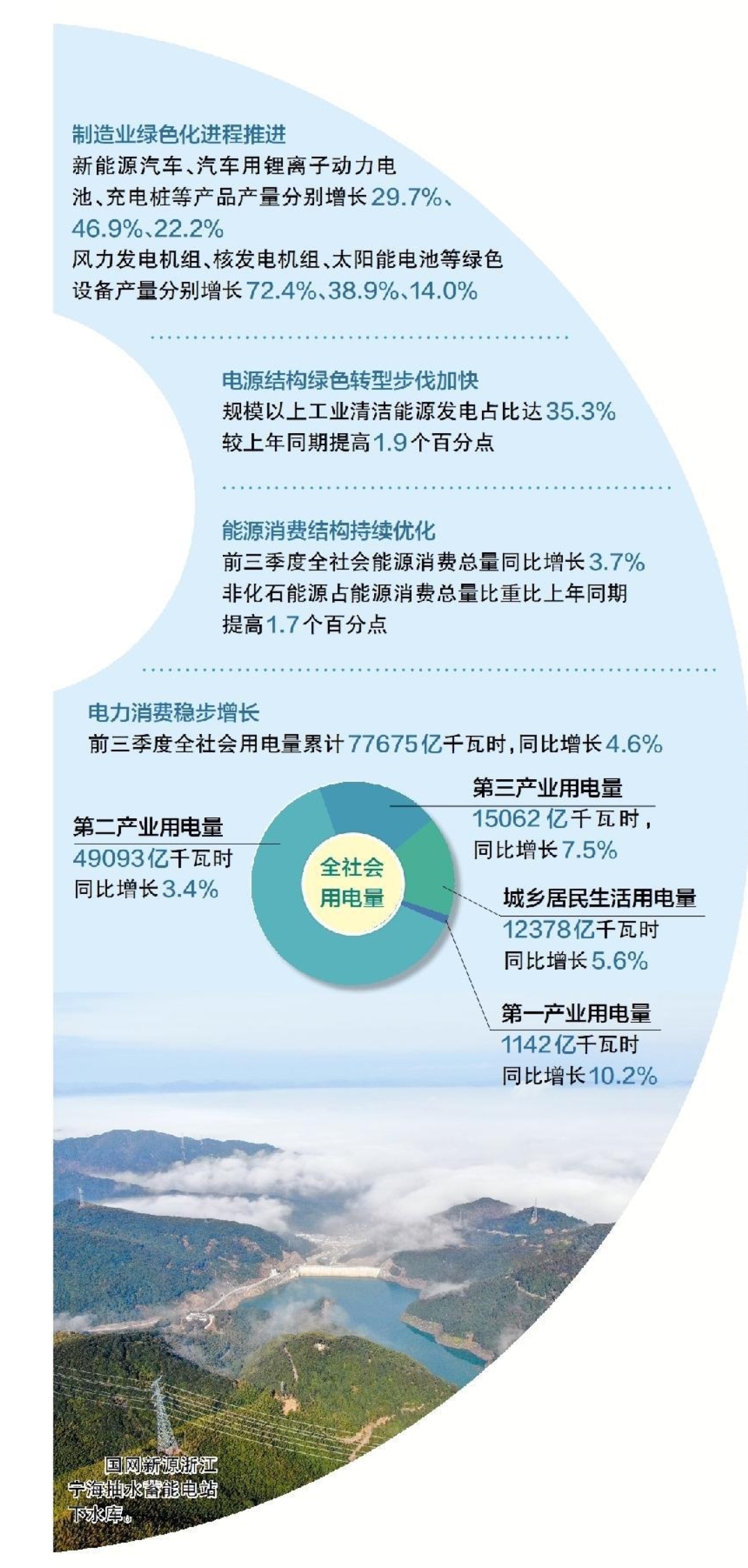 從能源消費(fèi)側(cè)來看,前三季度全社會能源消費(fèi)總量同比增長3.7%。國家統(tǒng)計局相關(guān)負(fù)責(zé)同志介紹,前三季度電力增長動能強(qiáng)勁,消費(fèi)結(jié)構(gòu)綠色轉(zhuǎn)型加速。能源消費(fèi)結(jié)構(gòu)持續(xù)優(yōu)化,非化石能源占能源消費(fèi)總量比重穩(wěn)步增長,比上年同期提高1.7個百分點(diǎn)。