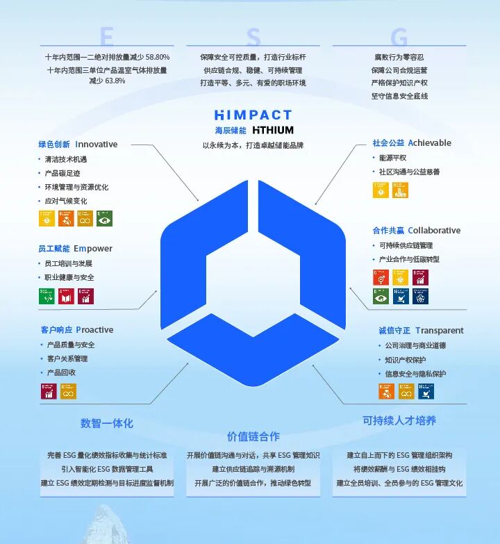 作為ESG理念的積極踐行者,海辰儲能以 “綠色創(chuàng)新、員工賦能、客戶響應(yīng)、社會公益、合作共贏、誠信守正” 六大核心支柱,構(gòu)建了 “HIMPACT 2037” 可持續(xù)發(fā)展戰(zhàn)略,全面踐行并兌現(xiàn)可持續(xù)發(fā)展承諾與目標(biāo)。