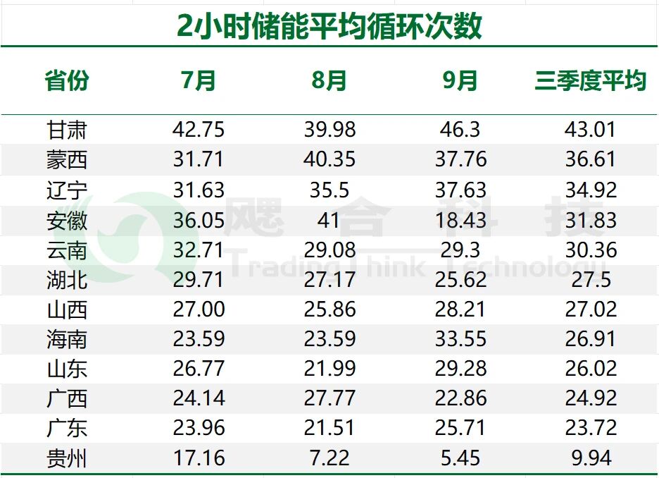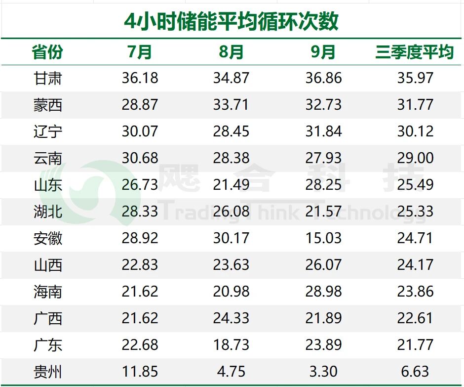 儲(chǔ)能 “充放電峰谷價(jià)差”,是影響循環(huán)次數(shù)的首要因素,三季度期間,甘肅峰谷價(jià)差變化明顯,其次,甘肅明確 “新能源消納優(yōu)先調(diào)用儲(chǔ)能”,因此甘肅儲(chǔ)能充放次數(shù)高于其他地區(qū);反觀貴州等南網(wǎng)省份,三季度期間南方地區(qū)降水集中,導(dǎo)致峰谷價(jià)差縮緊,收益降低,最終導(dǎo)致南網(wǎng)省份充放電循環(huán)次數(shù)普遍較少。