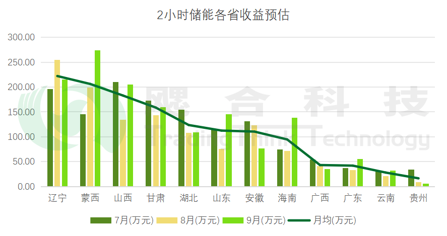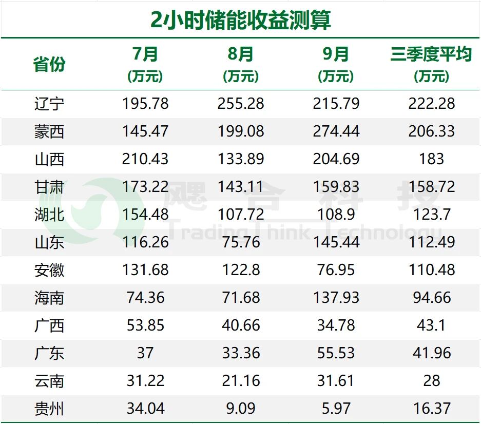2小時(shí)儲(chǔ)能收益中,遼寧、蒙西、山西收益較高,月均收益在180-230萬(wàn)元之間;南方區(qū)域收益整體偏低。