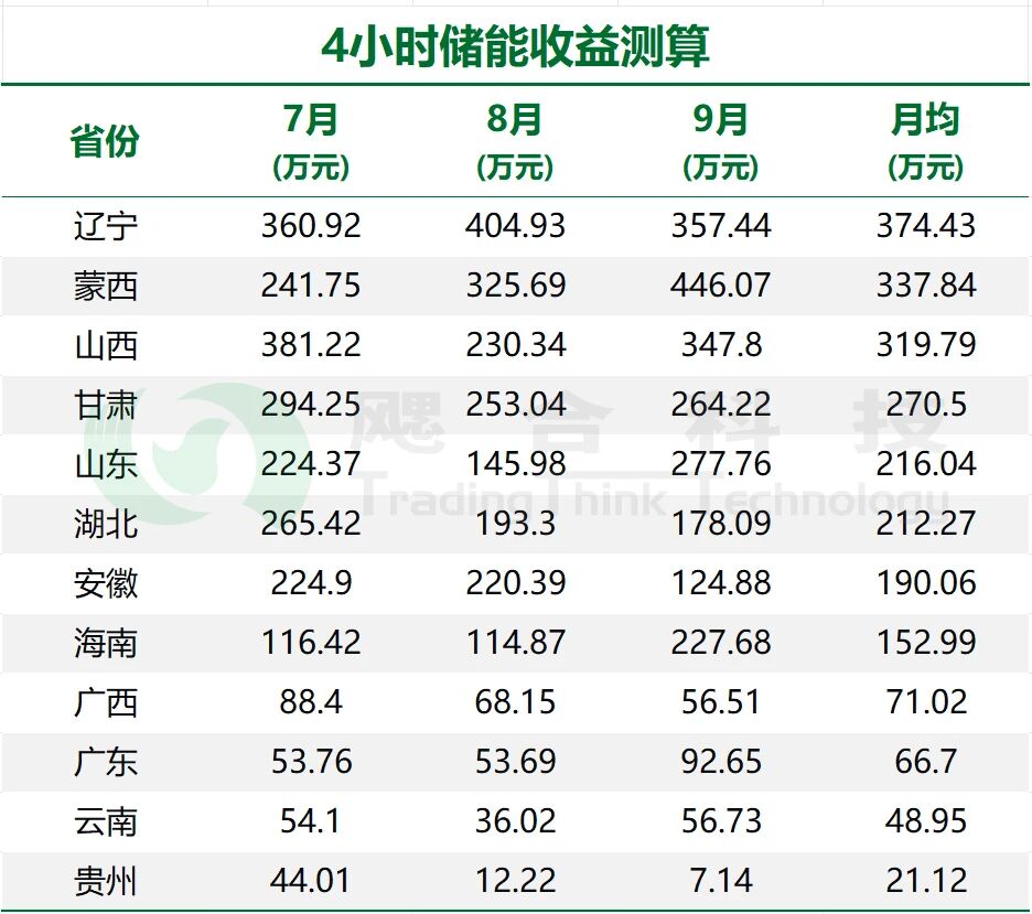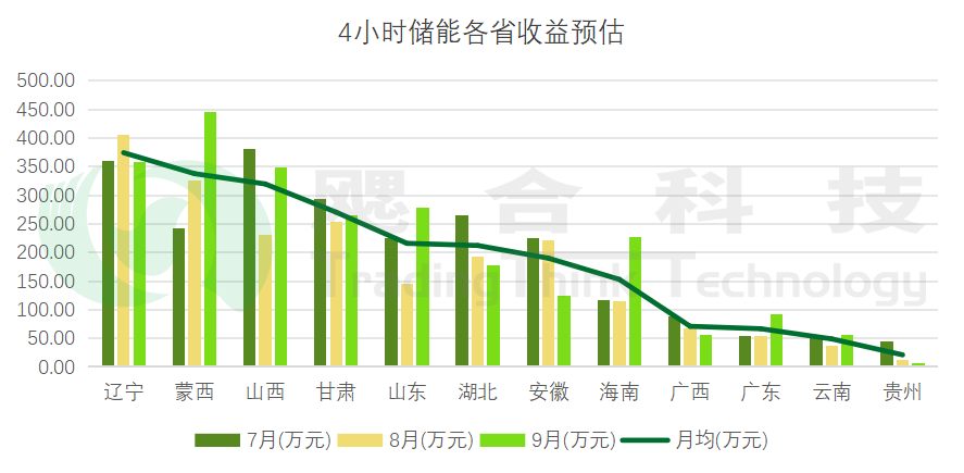4小時(shí)儲(chǔ)能的收益排名與2小時(shí)儲(chǔ)能基本一致,第一梯隊(duì)仍是遼寧、蒙西、山西三省,月均收益在310-380萬(wàn)元之間。