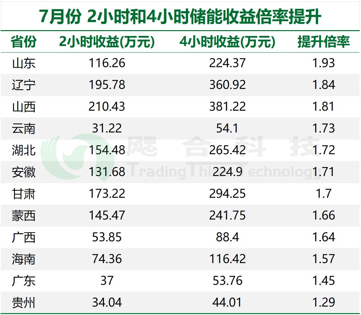 表6:2小時(shí)與4小時(shí)儲(chǔ)能系統(tǒng),7月份收益倍率提升