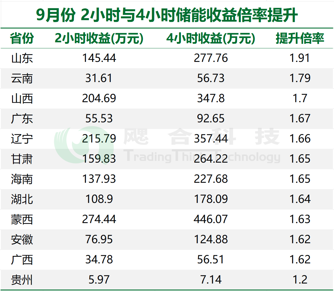 表8:2小時(shí)與4小時(shí)儲(chǔ)能系統(tǒng),9月份收益倍率提升