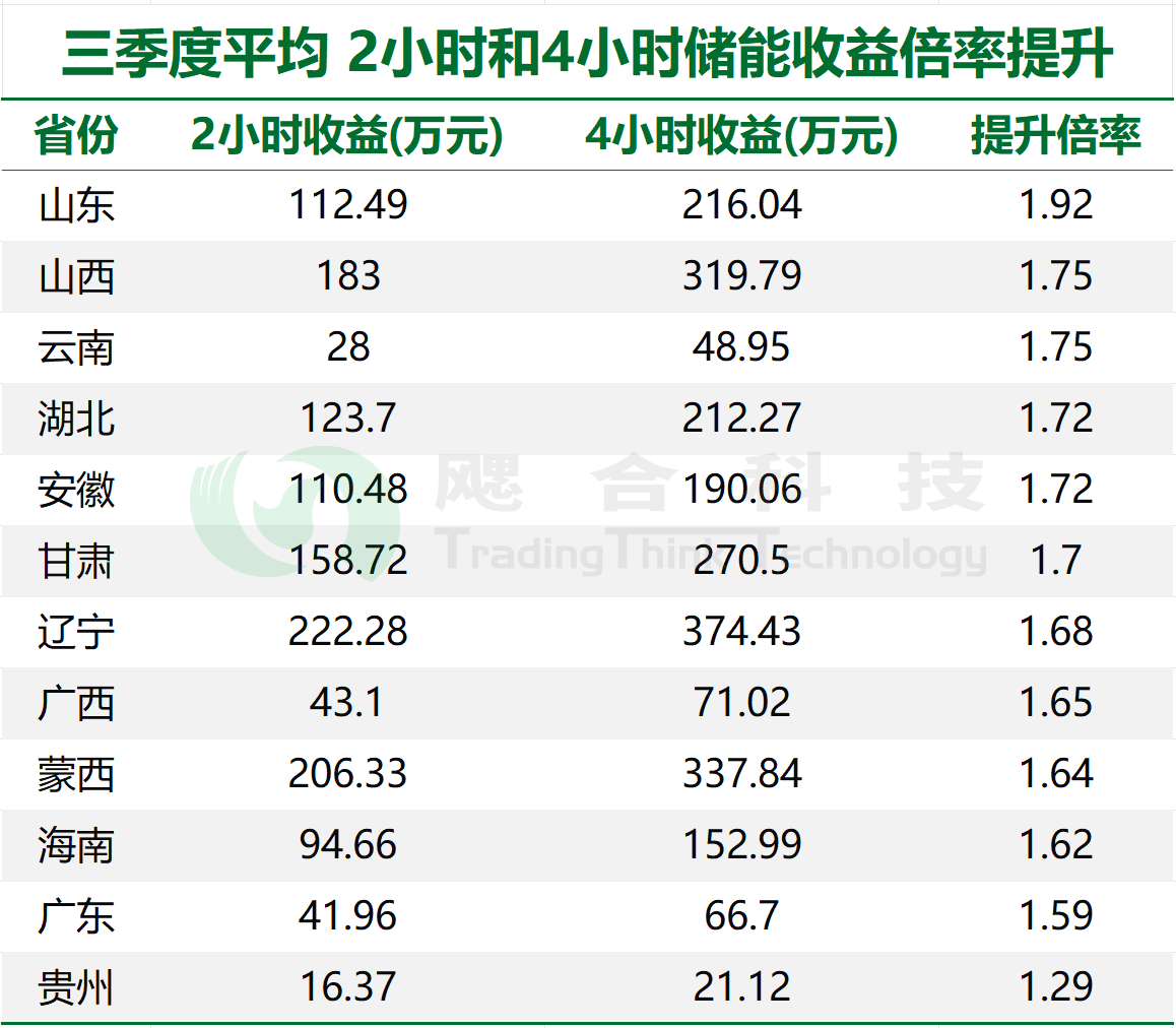 表9:2小時(shí)與4小時(shí)儲(chǔ)能系統(tǒng),三季度平均收益倍率提升