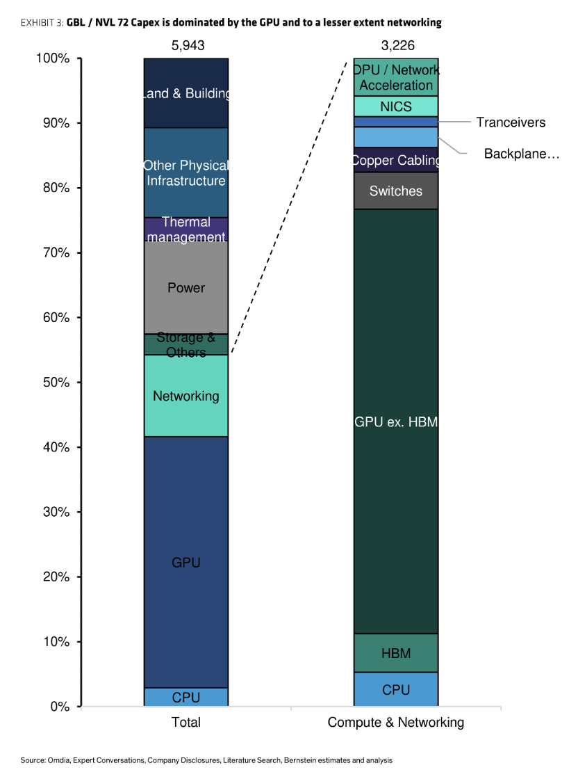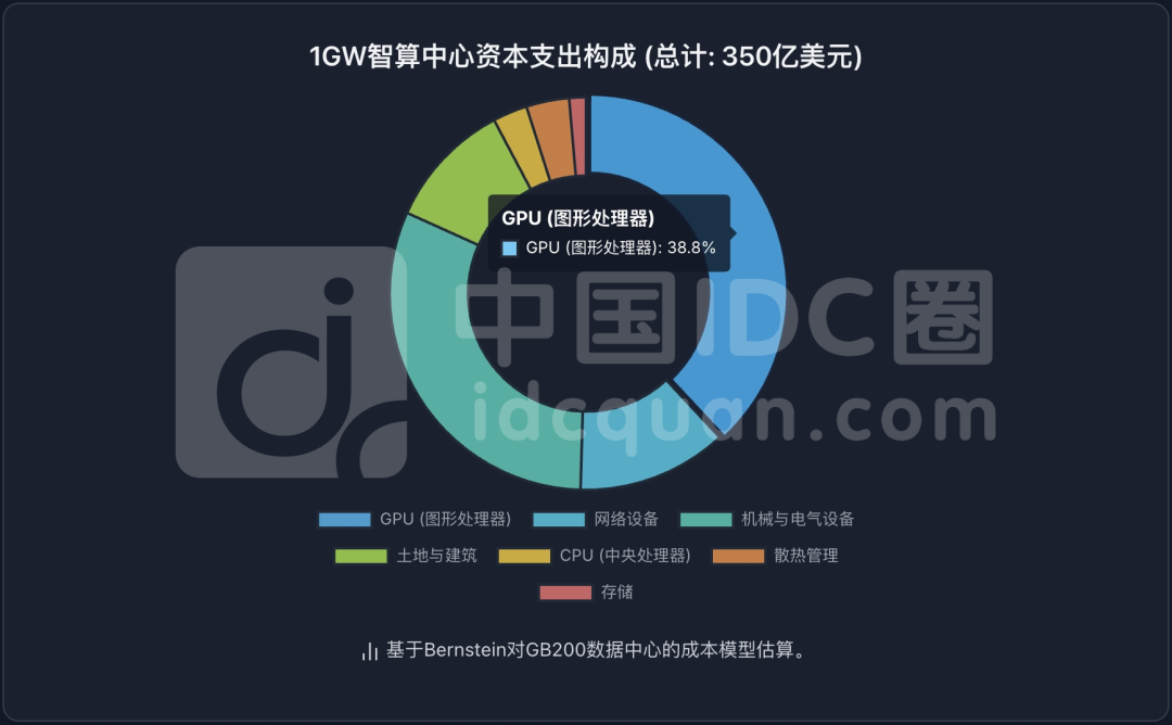 據(jù)Bernstein測算,建設(shè)并配置一座1GW的智算中心,總資本支出(Capex)約為350億美元。這一數(shù)字背后,是一個由IT設(shè)備與物理基礎(chǔ)設(shè)施共同構(gòu)成的復(fù)雜成本結(jié)構(gòu)。