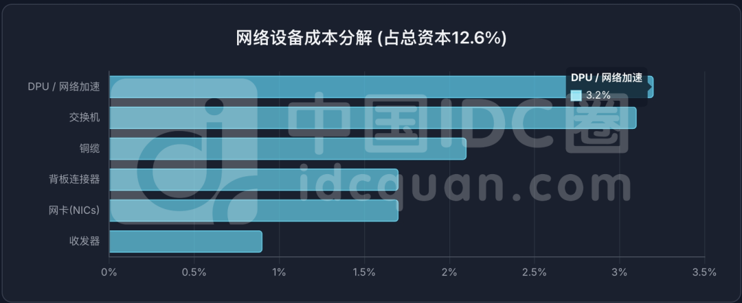 如果說GPU是心臟,那么高速網(wǎng)絡(luò)就是連接數(shù)萬個GPU的“血脈”,是僅次于GPU的第二大成本中心,占總資本支出的12.6%。但和GPU的高度集中不同,這部分支出相對分散,涵蓋了多個關(guān)鍵組件:包括DPU / 網(wǎng)絡(luò)加速器(3.2%)、交換機(3.1%)、銅纜(2.1%)、網(wǎng)卡 (NICs)(1.7%)、背板連接器(1.7%)。