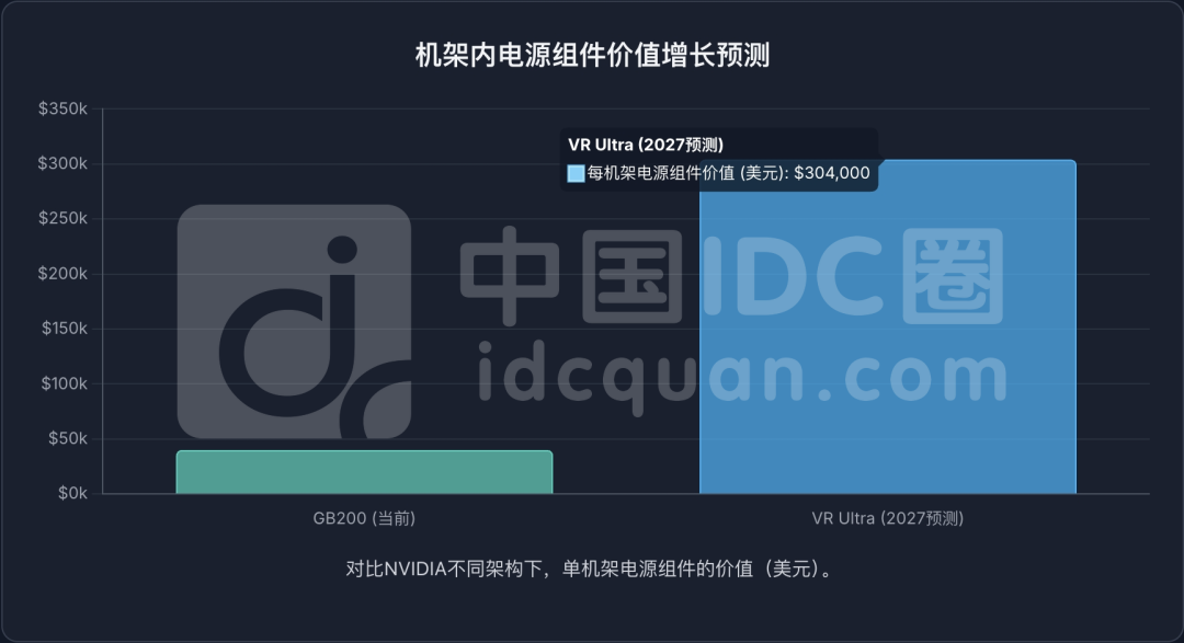 未來產(chǎn)業(yè)鏈價值面臨重構(gòu):電力與機架內(nèi)創(chuàng)新隨著芯片功耗的爆炸式增長,價值正在從芯片本身向“賦能芯片”的技術(shù)轉(zhuǎn)移。Bernstein報告甚至做出了一個大膽預(yù)測:到2027年的NVIDIA Rubin Ultra架構(gòu),機架內(nèi)電源組件(PSU、BBU等)的價值含量將是當(dāng)前GB200時代的7-8倍!這意味著,能夠解決機架內(nèi)高密度供電和配電難題的公司,將捕獲巨大的價值增長。電源組件市場規(guī)模預(yù)計將從2025年的38億美元增長至2027年的83億美元。