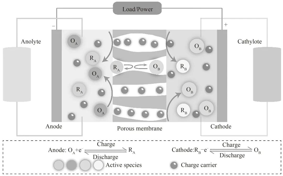 典型的液流電池及其所應(yīng)用的多孔離子傳導(dǎo)膜示意圖