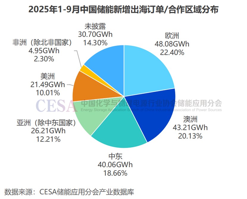 據(jù)CESA儲(chǔ)能應(yīng)用分會(huì)產(chǎn)業(yè)數(shù)據(jù)庫統(tǒng)計(jì),2025年1-9月,中國儲(chǔ)能新增出海訂單/合作總規(guī)模達(dá)214.7GWh,同比增長131.75%。其中,歐洲占比最高,達(dá)48.08GWh,占比22.4%。澳大利亞43.21GWh,占比20.13%。中東40.06GWh,占比18.66%。亞洲(除中東國家和中國)26.21GWh,占比12.21%。