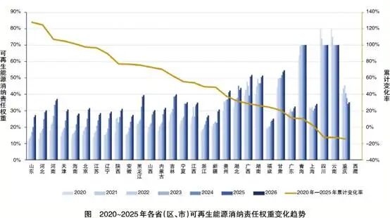 從縱向時(shí)間維度看,各?。▍^(qū)、市)綠電消費(fèi)指標(biāo)總體呈上升趨勢。2020年至2025年間,可再生能源消納責(zé)任權(quán)重累計(jì)變化幅度在-15%到128%之間,其中,相對增長幅度最高的為山東、河北、河南、天津、海南。西南水電大省可再生能源占比較高,可再生能源電力消納責(zé)任權(quán)重存在一定波動(dòng)。
