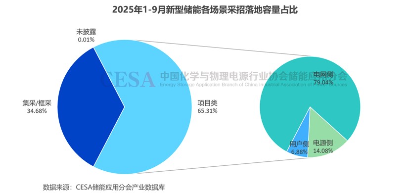 2025年1-9月,CESA儲能應用分會共追蹤到1728個儲能采招落地項目,剔除同一項目對EPC和不同儲能系統(tǒng)設備多次采購的情況,對應的實際儲能系統(tǒng)需求為89.2GW/321.2GWh,同比增長178%。其中,集采/框采落地規(guī)模為111.37 GWh,容量占比34.68%;項目類采招落地73.2GW/209.76GWh,容量占比65.31%。另有少量項目未披露采購形式。