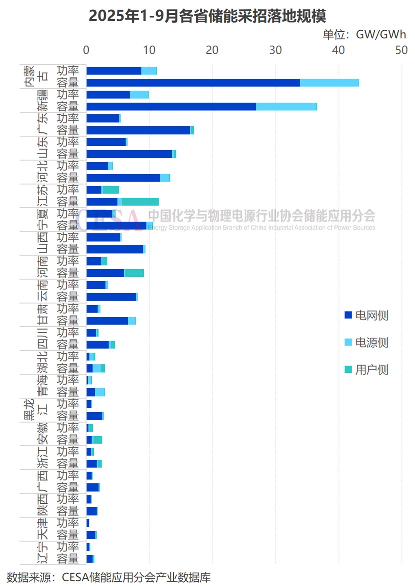 就省份來看,2025年1-9月,內(nèi)蒙古儲能采招落地項目規(guī)模躍居全國第一,達11.1GW/43.13GWh,占項目類采招落地總規(guī)模(73.2GW/209.76GWh)的15.17% (功率)/20.56%(容量),容量占比超過全國五分之一。伴隨新能源大基地和源網(wǎng)荷儲一體化項目推進,內(nèi)蒙古儲能市場潛力正加速釋放。