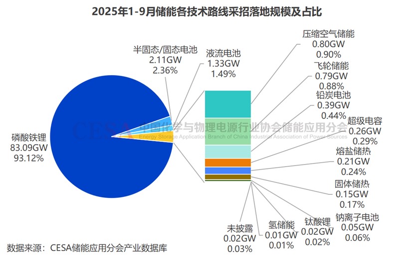 據(jù)CESA儲能應用分會產(chǎn)業(yè)數(shù)據(jù)庫不完全統(tǒng)計,2025年1-9月,磷酸鐵鋰電池儲能項目(含混合儲能項目中磷酸鐵鋰電池部分)采招落地規(guī)模高達83.09GW/295.47GWh,占比93.12%(功率)/91.99%(容量),穩(wěn)居絕對主導地位。成本成熟、產(chǎn)業(yè)鏈完善使其成為當前集中式和工商業(yè)儲能的首選路線。