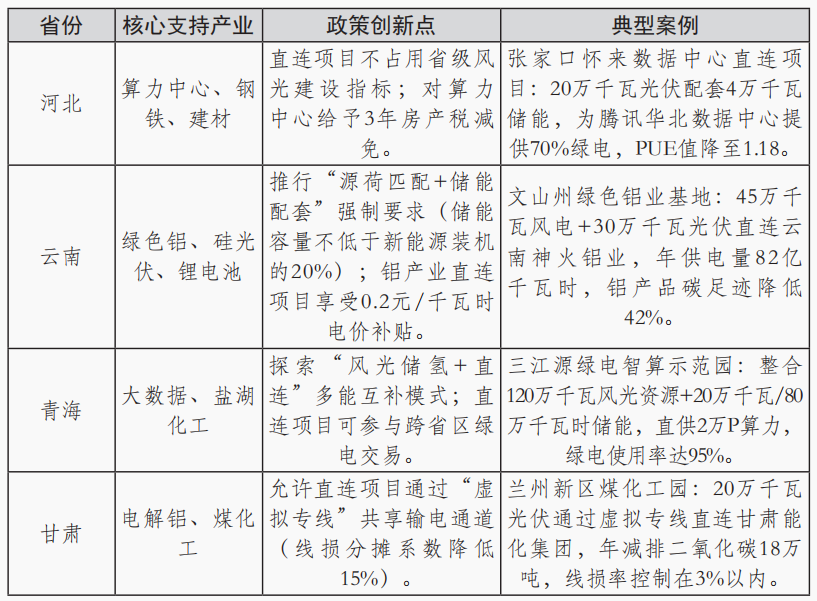 河北、云南、青海、甘肅四省率先出臺(tái)省級(jí)實(shí)施細(xì)則,結(jié)合區(qū)域資源稟賦與產(chǎn)業(yè)結(jié)構(gòu)形成差異化路徑,資源富集省份(云南、青海)側(cè)重“源荷時(shí)空匹配”,產(chǎn)業(yè)密集省份(河北、甘肅)側(cè)重“電網(wǎng)資源優(yōu)化”,為全國層面政策迭代提供了實(shí)踐樣本。例如,河北優(yōu)先支持算力、鋼鐵等行業(yè),要求直連項(xiàng)目不占用風(fēng)光指標(biāo);云南聚焦綠色鋁、硅光伏產(chǎn)業(yè),探索“源荷匹配+儲(chǔ)能配套”模式。