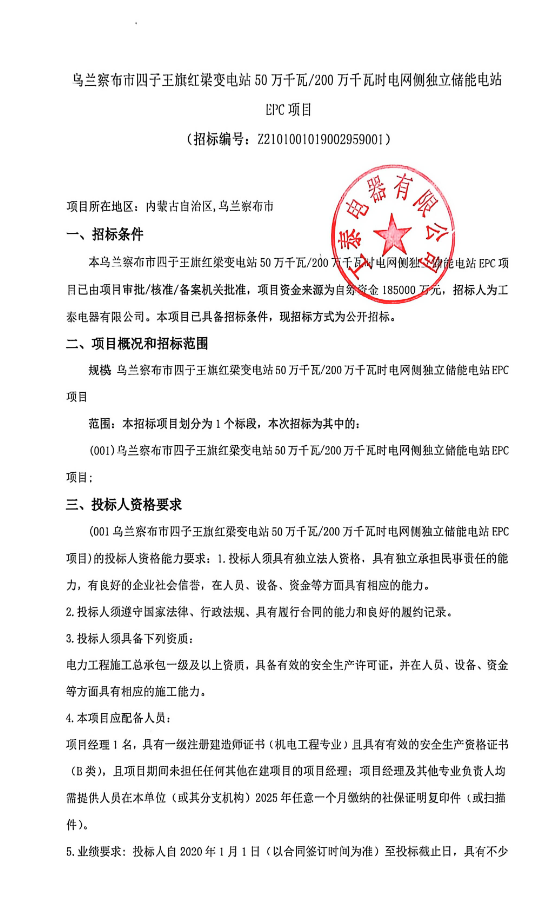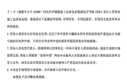 要求投標(biāo)人自2020年1月1日(以合同簽訂時(shí)間為準(zhǔn))至投標(biāo)止日,具有不少于1個(gè)(規(guī)模不少于200MW)的電化學(xué)儲(chǔ)能施工總承包業(yè)績或電壓等級220kV及以上變電站施工總承包業(yè)績。