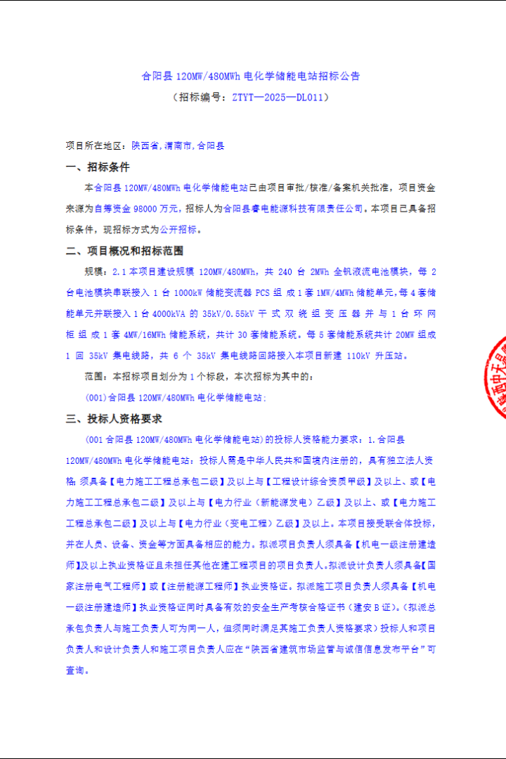 中國(guó)儲(chǔ)能網(wǎng)訊:10月31日,合陽縣睿電能源科技有限責(zé)任公司發(fā)布“合陽縣120MW/480MWh電化學(xué)儲(chǔ)能電站招標(biāo)公告”,資金來源為自籌,估算總投資9.8億元,相當(dāng)于單價(jià)約2元/Wh。