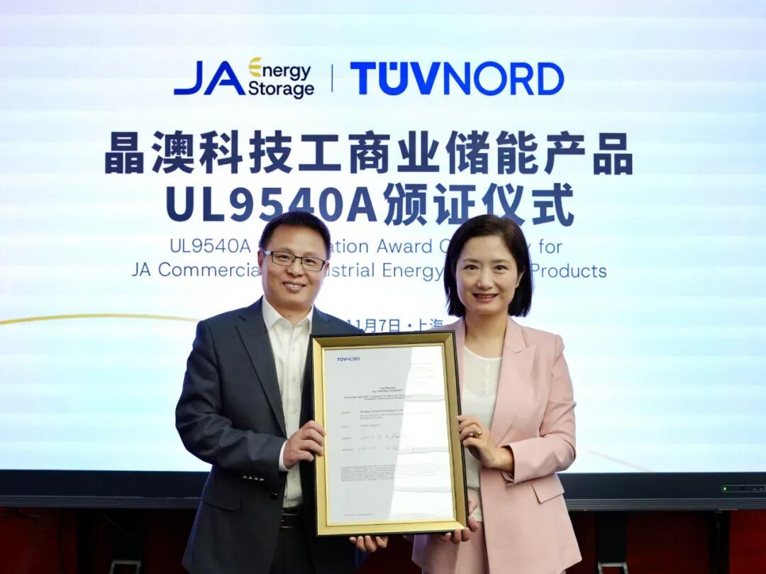 中國儲能網(wǎng)訊:11月7日,上海,晶澳科技工商業(yè)儲能產品順利通過了全球權威安全認證——UL 9540A:2025認證,并獲得TüV NORD頒發(fā)的國際權威認證報告。這一重要成果標志著晶澳科技在儲能領域的技術實力與產品安全性能獲得了國際權威機構的充分認可,進一步鞏固了其在全球儲能市場中的競爭優(yōu)勢。