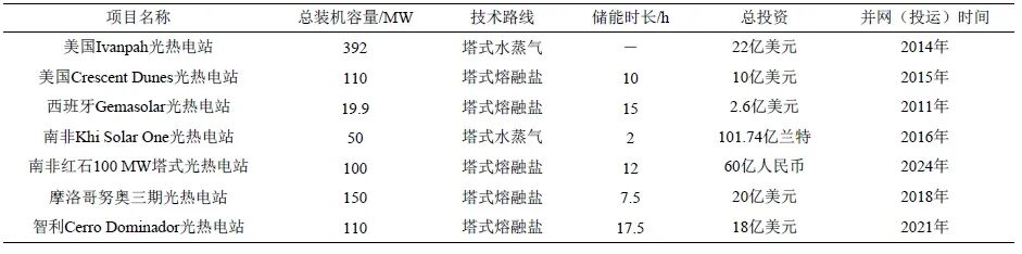 如上表所示,全球光熱發(fā)電領(lǐng)域的發(fā)展格局呈現(xiàn)出顯著的多元化特征,歐美、中東及非洲等地區(qū)成為其主要發(fā)展陣地。追溯歷史,塔式太陽(yáng)能熱發(fā)電技術(shù)的理論框架最早由蘇聯(lián)科學(xué)家提出,并于1950年成功設(shè)計(jì)實(shí)施了全球首座50千瓦規(guī)模的實(shí)驗(yàn)性塔式太陽(yáng)能熱發(fā)電裝置。隨后,法國(guó)在1976年實(shí)現(xiàn)了技術(shù)上的重要跨越,不僅建成并運(yùn)行了64千瓦的同類裝置,還同步完成了全球首座100千瓦功率的塔式太陽(yáng)能熱發(fā)電系統(tǒng)。1982年,美國(guó)成功建設(shè)了“Solar One”塔式太陽(yáng)能電站。1996年,基于“Solar One”的經(jīng)驗(yàn),建成了“Solar Two”塔式電站,并創(chuàng)新性地將傳熱介質(zhì)由水改為硝酸鹽。該電站配備了當(dāng)時(shí)最先進(jìn)的儲(chǔ)熱系統(tǒng),并成功運(yùn)行至1999年。其間,“Solar Two”首次應(yīng)用熔鹽技術(shù)并實(shí)現(xiàn)穩(wěn)定運(yùn)行,有力推動(dòng)了太陽(yáng)能塔式光熱電站的商業(yè)化進(jìn)程。進(jìn)入21世紀(jì),Ivanpah電站于2014年正式投入商業(yè)運(yùn)行,作為目前全球最大的塔式太陽(yáng)能電站,其總裝機(jī)容量高達(dá)392兆瓦,由美國(guó)Bright Source、Google及NRG公司聯(lián)合打造。2007年,西班牙設(shè)計(jì)建造了裝機(jī)容量為11兆瓦PS10塔式光熱電站,該電站是歐洲首座商業(yè)化塔式電站。2013年,PS20太陽(yáng)能塔式電站在PSl0電站的基礎(chǔ)上建造完成。近年來(lái),拉丁美洲也迎來(lái)了光熱發(fā)電領(lǐng)域的突破性進(jìn)展,2021年,智利北部阿塔卡馬沙漠的Cerro Dominador塔式光熱發(fā)電站成功并網(wǎng),成為該地區(qū)首個(gè)光熱發(fā)電項(xiàng)目,總投資額高達(dá)10億美元。