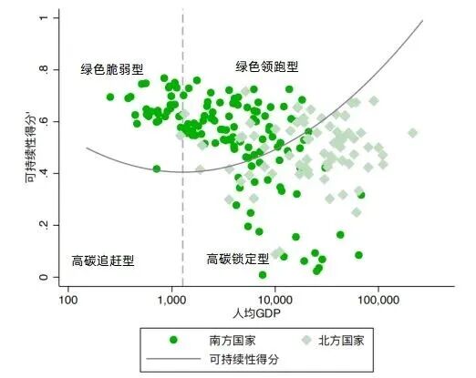 研究發(fā)現(xiàn),可持續(xù)性與經(jīng)濟(jì)發(fā)展呈現(xiàn)“U型”關(guān)系。當(dāng)經(jīng)濟(jì)發(fā)展跨越人均GDP約為1254美元水平的關(guān)鍵拐點后,一國可續(xù)性維度在經(jīng)歷谷底后開始穩(wěn)步回升,經(jīng)濟(jì)增長逐漸與碳排放“脫鉤”?;谶@條U型曲線以及各國當(dāng)前可持續(xù)性的實際表現(xiàn),可以將全球國家劃分為四種不同的發(fā)展路徑類型,即綠色脆弱型經(jīng)濟(jì)體、高碳鎖定型經(jīng)濟(jì)體、綠色領(lǐng)跑型經(jīng)濟(jì)體、高碳追趕型經(jīng)濟(jì)體。