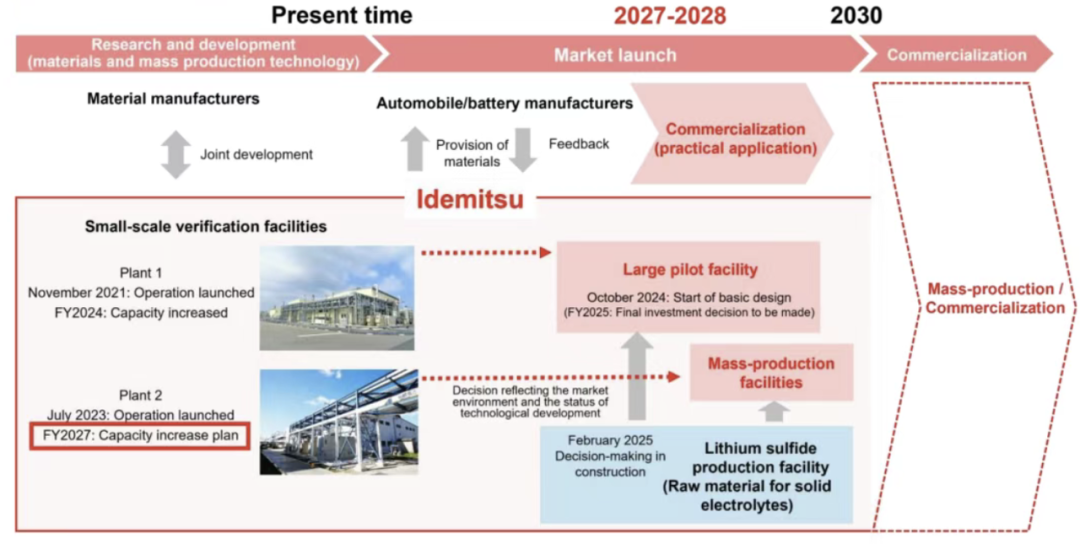 早在2013年,出光就與豐田聯(lián)合開發(fā)固態(tài)電池,并在2021年啟動了噸級硫化物電解質(zhì)小試工廠,千葉工廠已完成擴產(chǎn),樣品年產(chǎn)能力提升至十幾噸規(guī)模,并計劃在2027年前建成全球領(lǐng)先的硫化鋰量產(chǎn)設(shè)施。