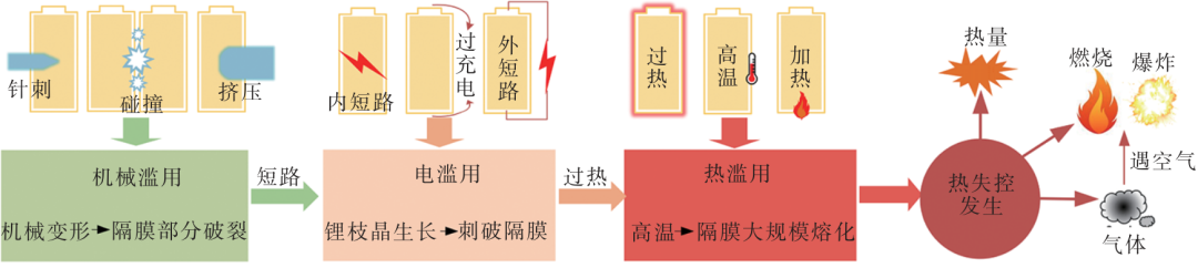 誘發(fā)鋰離子電池熱失控的濫用條件,如機械濫用、電濫用和熱濫用往往存在一定的關(guān)聯(lián),如下圖所示。