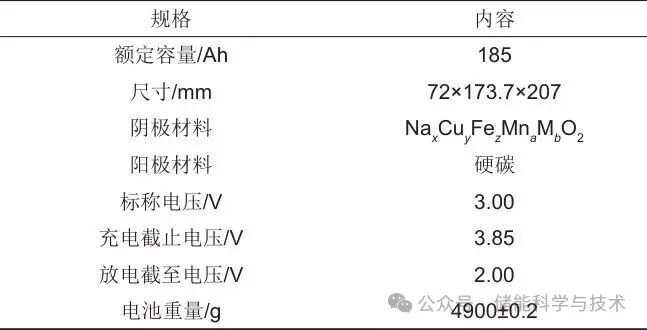 本研究選用標(biāo)稱容量為185 Ah的商用方形鈉離子電池作為測(cè)試對(duì)象。該電池采用層狀氧化物NaxCuyFezMnaMbO2(其中,M包括Li、Ni、Mg、Zn、Co、Al、Zr和Ti中的至少一種,0.6<x<1.2,0<y<0.5,0<z≤0.5,0<a≤0.8,0≤b≤0.5,且y+z+a+b=1)作為正極材料,硬碳作為負(fù)極材料。電池的詳細(xì)規(guī)格參數(shù)列于表1。在實(shí)驗(yàn)預(yù)處理階段,所有電池樣品均通過充放電測(cè)試儀以CC-CV(恒流-恒壓)模式進(jìn)行充電。為確保電池化學(xué)性質(zhì)穩(wěn)定性并建立可靠的基準(zhǔn)數(shù)據(jù),實(shí)驗(yàn)前對(duì)所有電池樣品進(jìn)行了三次完整的充放電循環(huán)。實(shí)驗(yàn)開始前,所有電池均充至100%荷電狀態(tài)(SOC),以模擬實(shí)際應(yīng)用中的標(biāo)準(zhǔn)工作條件。