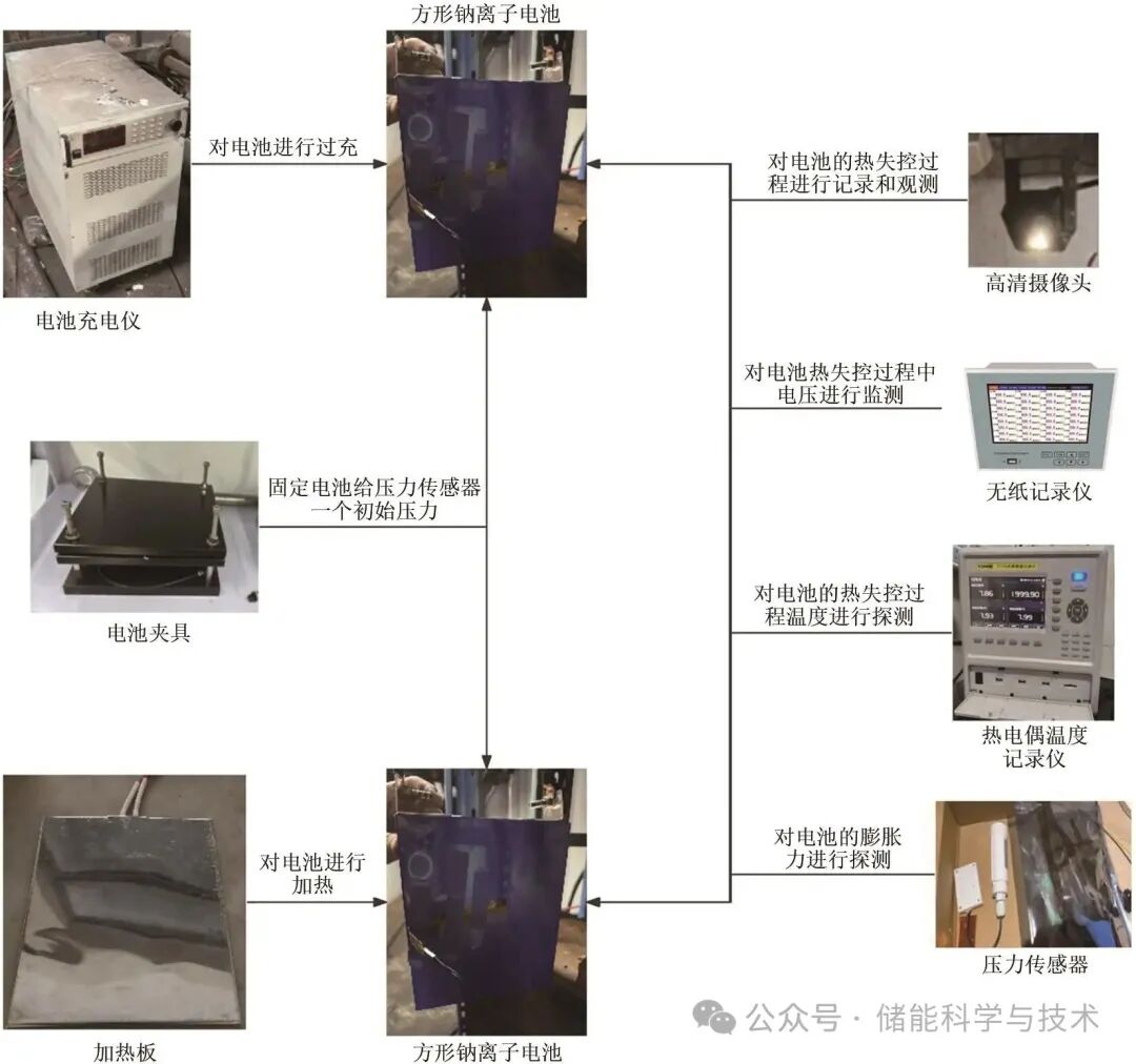 目前對(duì)鈉離子電池安全性的研究主要關(guān)注其熱行為特性。Li等探究了鈉離子電池中帶電層狀氧化物正極的熱分解機(jī)制,發(fā)現(xiàn)鋰摻雜通過抑制過渡金屬離子溶出和減少氧氣釋放,有效提升了熱穩(wěn)定性。他們建立的動(dòng)力學(xué)三要素模型為開發(fā)更安全的電池材料提供了理論基礎(chǔ)。Rui等通過球形壓痕測(cè)試結(jié)合多物理場(chǎng)計(jì)算模型,研究了鈉離子電池在機(jī)械濫用條件下的安全性能與失效機(jī)制。研究表明,與鋰離子電池相比,鈉離子電池呈現(xiàn)出較緩慢的內(nèi)短路觸發(fā)過程和顯著較低的內(nèi)短路溫度,證實(shí)其在機(jī)械負(fù)載下具有更高的安全邊際。Li等系統(tǒng)比較了鈉離子電池與鋰離子電池在不同加熱功率下的熱失控行為,發(fā)現(xiàn)隨著加熱功率增加,鈉離子電池的熱危害顯著增加而氣體產(chǎn)生危害減少。鈉離子電池的整體熱失控危害程度介于NCM523和LFP電池之間,且不會(huì)自發(fā)燃燒,凸顯了鈉基能源存儲(chǔ)系統(tǒng)的研究?jī)r(jià)值。Li等考察了不同荷電狀態(tài)下大型棱柱形鈉離子電池的熱失控行為,發(fā)現(xiàn)較高的荷電狀態(tài)會(huì)導(dǎo)致更嚴(yán)重的熱危害,其中氫氣在排出氣體中的比例高達(dá)42%。研究人員還觀察到一種自熄滅現(xiàn)象,即熱失控過程中產(chǎn)生的強(qiáng)烈氣體能有效分散熱量并將可燃?xì)怏w與氧氣和火花隔離。Teng等研究了鈉離子電池(SIBs)從材料到電池級(jí)別的熱穩(wěn)定性和安全特性,揭示了固體電解質(zhì)界面(SEI)分解在100 ℃以下就開始發(fā)生,正極材料(NaxNi1/3Fe1/3Mn1/3O2)與電解液之間的反應(yīng)構(gòu)成了熱濫用過程中的主要放熱事件,且熱量產(chǎn)生與氣體生成行為不一定相關(guān)。Mei等對(duì)鋰離子電池和鈉離子電池的熱安全性進(jìn)行了全面比較,通過加速量熱儀測(cè)試發(fā)現(xiàn)磷酸鐵鋰(LFP)電池展現(xiàn)出最低的熱失控風(fēng)險(xiǎn)和嚴(yán)重程度,鈉離子電池的熱穩(wěn)定性與LFP相當(dāng),但具有最低的安全排氣溫度和最長(zhǎng)的排氣到熱失控的時(shí)間間隔,有利于及早預(yù)警??傮w而言,LFP電池的熱危害最低,其次是鈉離子電池,再次是三元材料(NCM523)電池。然而,這些研究大多局限于單一濫用條件下的表現(xiàn),難以全面反映實(shí)際應(yīng)用中大容量鈉離子電池的熱失控行為特征。不同濫用條件下,如過熱和過充等情況下的熱失控機(jī)理和表現(xiàn)形式存在顯著差異,亟需進(jìn)行系統(tǒng)性研究。在實(shí)際應(yīng)用環(huán)境中,鈉離子電池可能面臨多種濫用條件,其中過熱和過充是最為常見的兩種情況。過熱通常源于外部熱源、短路或環(huán)境溫度過高,而過充則主要由電池管理系統(tǒng)故障或充電控制失效引起。這兩種濫用條件不僅在觸發(fā)機(jī)制上存在差異,其誘發(fā)的熱失控過程和表現(xiàn)形式也呈現(xiàn)出明顯不同。目前關(guān)于大容量商用鈉離子電池在這兩種濫用條件下熱失控行為的對(duì)比研究尚不充分,尤其缺乏對(duì)熱失控過程中溫度分布、電壓變化和膨脹力演變等關(guān)鍵參數(shù)的系統(tǒng)監(jiān)測(cè)與分析。