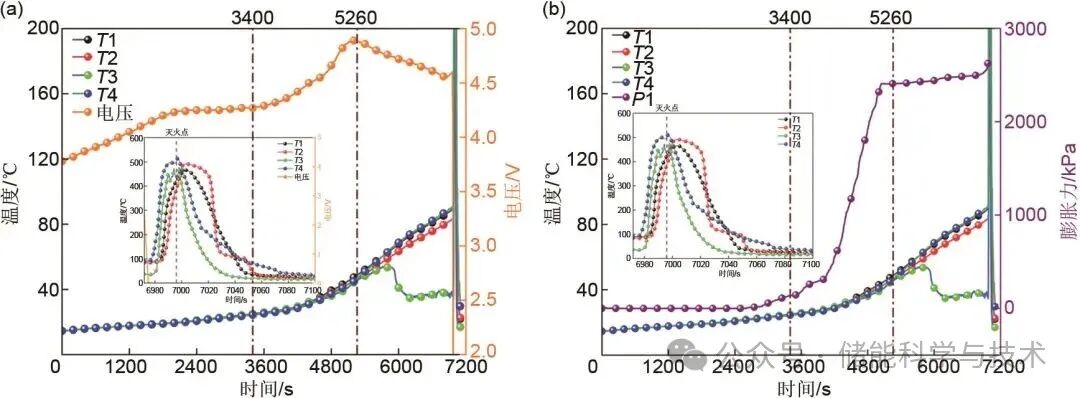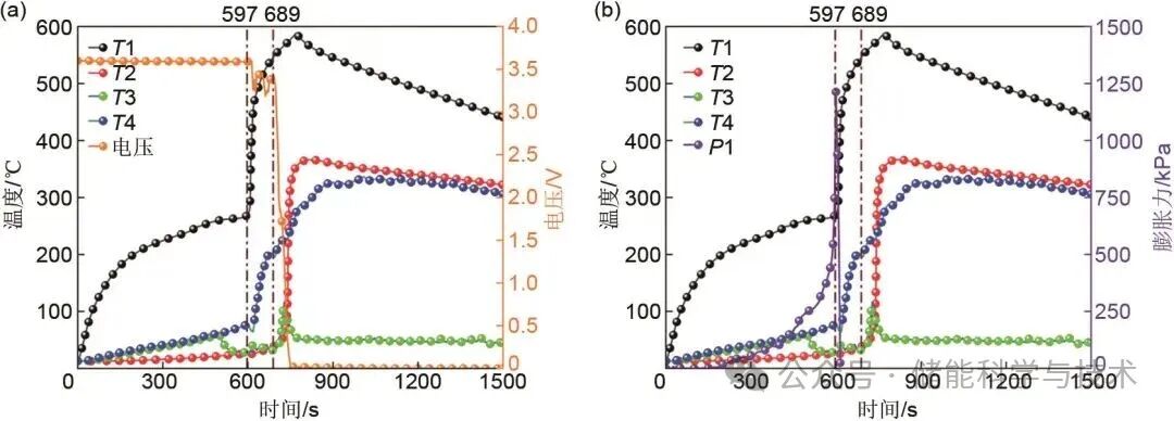 圖5 過充條件下鈉離子電池?zé)崾Э靥卣鲄?shù)變化曲線:(a) 溫度與電壓變化曲線;(b) 溫度與膨脹力變化曲線