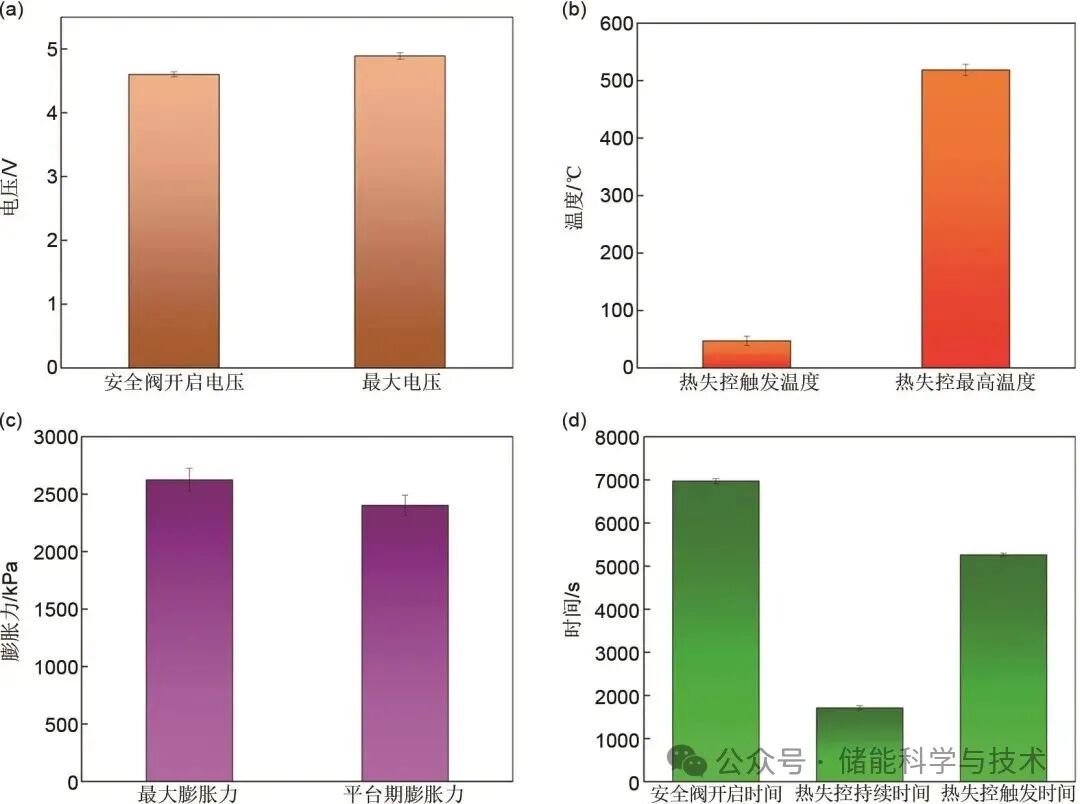 本實(shí)驗(yàn)進(jìn)行了兩次重復(fù)性測(cè)試以驗(yàn)證結(jié)論的可靠性與穩(wěn)定性。實(shí)驗(yàn)結(jié)果表明,所獲取的數(shù)據(jù)與曲線與圖5呈現(xiàn)高度一致性,證實(shí)了測(cè)試方法具有良好的重現(xiàn)性及實(shí)驗(yàn)設(shè)計(jì)的合理性。圖6呈現(xiàn)的過充熱失控關(guān)鍵參數(shù)誤差棒圖量化了測(cè)量參數(shù)的統(tǒng)計(jì)分布:時(shí)間維度上觀察到約±50 s的標(biāo)準(zhǔn)偏差,這主要反映了電池過充過程中內(nèi)部電化學(xué)反應(yīng)速率的固有隨機(jī)性以及不同電池樣品間材料特性的微小差異;電壓參數(shù)表現(xiàn)出±0.04 V的波動(dòng)范圍,該偏差主要源于電池樣品間內(nèi)阻的差異性,符合生產(chǎn)批次的正常波動(dòng)范圍;溫度參數(shù)方面記錄到±12 ℃的測(cè)量不確定度,這與熱電偶探測(cè)位置的微小變化、環(huán)境溫度波動(dòng)以及熱傳導(dǎo)效率的樣品差異有關(guān);膨脹力測(cè)量值呈現(xiàn)±50 kPa的標(biāo)準(zhǔn)偏差,這歸因于電池結(jié)構(gòu)完整性、電解液分解氣體生成速率及內(nèi)部壓力分布的樣品間差異。上述誤差均在實(shí)驗(yàn)預(yù)設(shè)的可接受范圍內(nèi),不影響對(duì)過充熱失控機(jī)理及安全臨界值的總體判斷,且為后續(xù)研究提供了重要的參數(shù)波動(dòng)基準(zhǔn)。