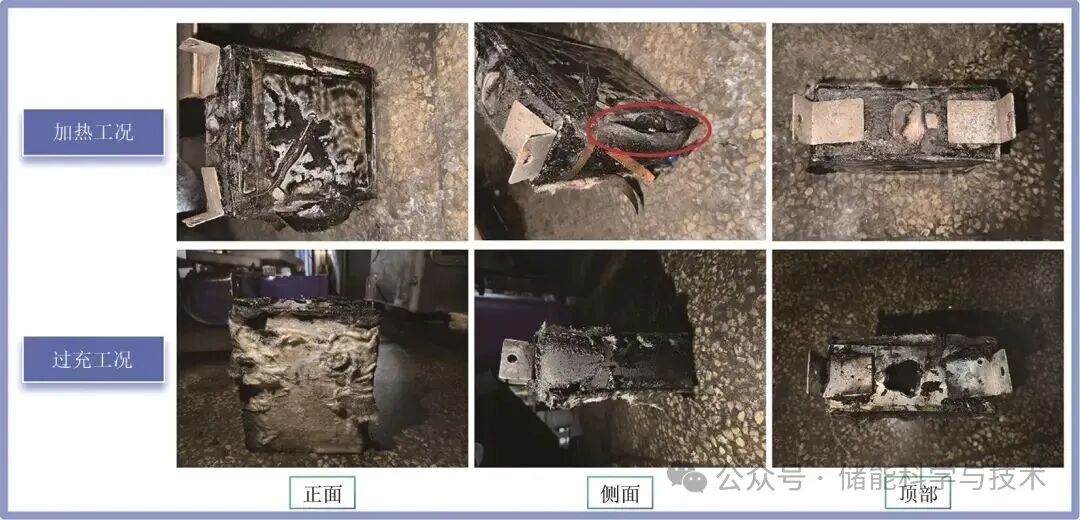 (3)失效模式分析表明:加熱條件下電池安全閥區(qū)域保持相對(duì)完整性,主要破壞集中于熱面區(qū)域;而過充條件下安全閥區(qū)域遭受嚴(yán)重破壞,這進(jìn)一步證實(shí)了不同濫用條件下熱失控的擴(kuò)展路徑與釋能方式存在本質(zhì)差異,對(duì)鈉離子電池安全設(shè)計(jì)提出了差異化優(yōu)化要求。