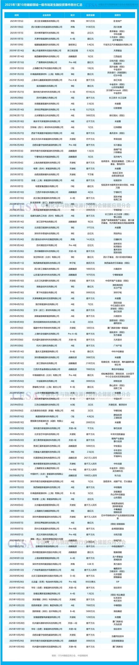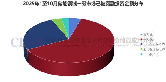 據(jù)CESA儲能應(yīng)用分會數(shù)據(jù)庫不完全統(tǒng)計,2025年前三季度,國內(nèi)新型儲能新增裝機(jī)總規(guī)模為31.77GW/85.11GWh,同比增長19.3%(功率)/28.41%(容量)。面對如此龐大的市場規(guī)模,對金融支持的需求也日益迫切。具體到融資情況來看,2025年1至10月儲能領(lǐng)域一級市場發(fā)生融投資事件283起,其中未披露具體融資金額的176起。在已披露金額的107起融投資事件中,百萬級融資5起,占比4.67%;千萬級融資67起,占比62.61%;1-5億元級融資28起,占比26.16%;5-10億元級融資4起,占比3.73%;10億元以上融資3起,占比2.8%。