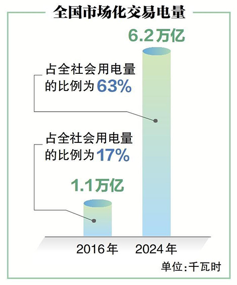 看規(guī)模,我國市場化交易電量由2016年的1.1萬億千瓦時增至2024年的6.2萬億千瓦時,占全社會用電量的比例由17%提升至63%。