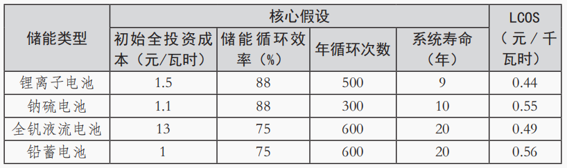 平準(zhǔn)化儲(chǔ)能成本(LCOS)量化了特定儲(chǔ)能技術(shù)和應(yīng)用場(chǎng)景下單位放電量的折現(xiàn)成本,考慮了影響放電壽命成本的所有技術(shù)和經(jīng)濟(jì)參數(shù),可以與LCOE類(lèi)比,是進(jìn)行儲(chǔ)能技術(shù)成本比較的基本工具,表2梳理了主要電化學(xué)儲(chǔ)能在相關(guān)核心假設(shè)下LCOS測(cè)算數(shù)據(jù)。目前電化學(xué)儲(chǔ)能的LCOS為0.4~0.6元/千瓦時(shí),仍不具備經(jīng)濟(jì)性。