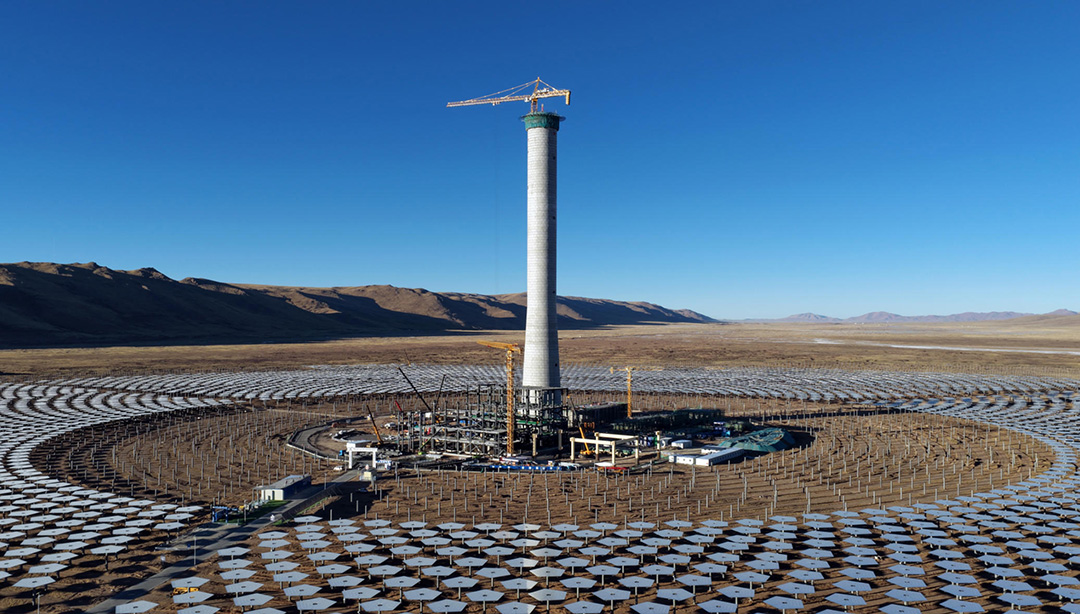 西藏安多光熱項(xiàng)目是全球海拔最高、西藏地區(qū)首個(gè)塔式光熱發(fā)電項(xiàng)目,電站裝機(jī)容量100MW。作為電站集熱系統(tǒng)核心的吸熱塔設(shè)計(jì)筒身高度185米,底部直徑25米,頂部直徑17米,屬高柔細(xì)結(jié)構(gòu)塔體。塔頂需承載屏保吸熱器等重型設(shè)備,總荷載逾1800噸。