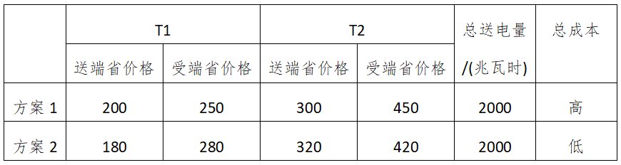 根據《南方區(qū)域電力市場現貨電能量交易實施細則》,南方區(qū)域電力現貨市場的目標函數為系統總發(fā)電成本最小。因此,達到最優(yōu)解時,出清結果一定是總成本最低的方案。而跨省送電的目的是通過增加送端省低價機組出力、降低受端省高價機組出力來降低系統總成本。方案1中,若安排T2增送,T1減送,則能夠為系統節(jié)省的總成本為:(450-300)-(250-200)=100元/兆瓦時,說明此時區(qū)域現貨市場還能通過調整各時段跨省送電量來優(yōu)化系統總成本,因此不可能為經濟調度環(huán)節(jié)市場發(fā)布的結果。而在方案2中,調整T1、T2的送電量節(jié)省的系統成本為:(420-320)-(280-180)=0元/兆瓦時,此時各時段的發(fā)電計劃和聯絡線計劃已達經濟性最優(yōu)狀態(tài),滿足發(fā)布結果條件。