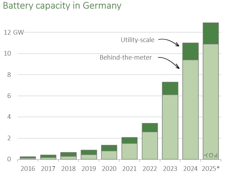 近年來(lái),德國(guó)電力系統(tǒng)中大規(guī)模電池儲(chǔ)能(front-of-the-meter, FTM)裝機(jī)快速增長(zhǎng),但其總規(guī)模仍落后于數(shù)量龐大的戶用光伏+電池(behind-the-meter, BTM)系統(tǒng)。部分研究者據(jù)此提出批評(píng):德國(guó)“選錯(cuò)了電池”——過(guò)度激勵(lì)表后小規(guī)模儲(chǔ)能,而忽視了對(duì)系統(tǒng)更高效、更廉價(jià)的大型公共事業(yè)級(jí)儲(chǔ)能。