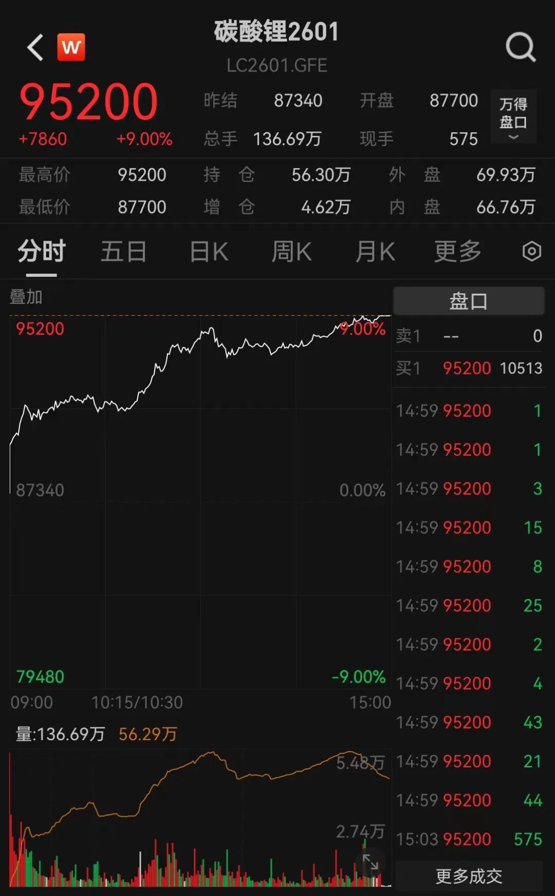 11月17日,碳酸鋰期貨主力合約持續(xù)走高,截至收盤,該主力合約漲停,報95200元/噸,創(chuàng)2024年7月以來新高。