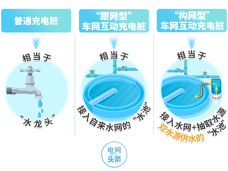 “跟網(wǎng)型”車網(wǎng)互動(dòng)充電樁,像一個(gè)接入自來水網(wǎng)的“水池”,只要自來水網(wǎng)不斷水,“水池”就能根據(jù)指令,放水(充電)、蓄水(放電),實(shí)現(xiàn)能量雙向交互。
