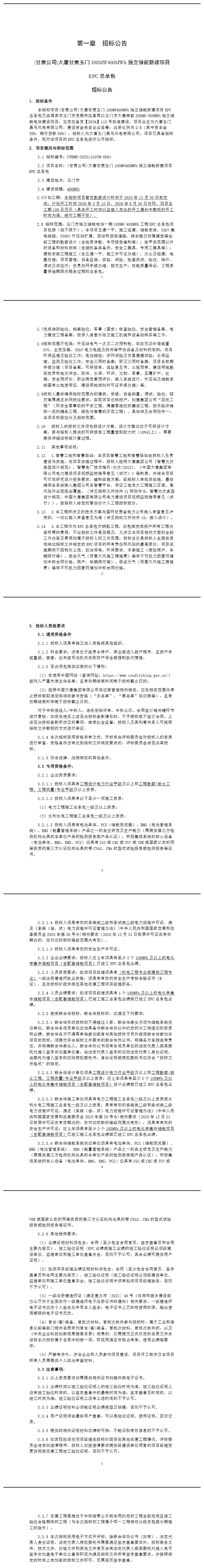 在投標(biāo)人資格要求上,投標(biāo)人近5年需擁有至少2個(gè)100MWh及以上電化學(xué)集中儲(chǔ)能EPC竣工項(xiàng)目。此外,項(xiàng)目接受不超過3家單位組成的聯(lián)合體投標(biāo)。