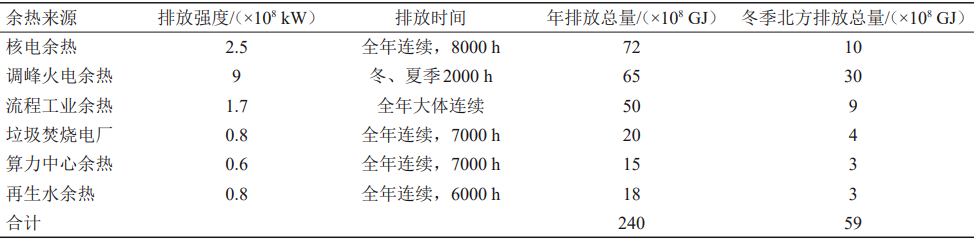 在更多的工業(yè)生產(chǎn)過程中,熱量排放過程過于分散而難以有效回收利用,需要外界提供足夠的余熱資源。當然,也有很多工業(yè)過程排放大量的低品位余熱且遠大于用熱需求。預(yù)測我國未來的余熱資源,沿海地區(qū)將建設(shè)裝機容量約為2×108 kW的核電站,核能反應(yīng)堆釋放的熱量中僅有40%轉(zhuǎn)換為電力,而約60%作為余熱通過海水冷卻排放,僅此每年可提供7×109 GJ以上的熱量。將保留裝機容量約為7×108 kW的火電,每年運行約2000 h,發(fā)電1.5×1012 kW·h,這些火電廠在發(fā)電的同時也將排放約6.5×109 GJ的熱量。此外,冶金、有色、化工、建材等流程工業(yè),算力中心,垃圾焚燒廠,電網(wǎng)大型變壓器,污水處理后得到的中水等,都可釋放出大量余熱。整體上,我國每年約有2.4×1010 GJ的人類活動排放余熱(見表1)。采用熱泵技術(shù)、COP平均值為3時,只要回收余熱總量的40%(9×109 GJ)即可滿足需求?;厥崭黝愑酂岵⑼ㄟ^管網(wǎng)匯集,輸送到需要用熱的工業(yè)生產(chǎn)、建筑終端,在各個終端根據(jù)具體的用熱需求,通過熱泵制備成適宜參數(shù)的熱量,據(jù)此構(gòu)成余熱共享系統(tǒng),解決建筑采暖和工業(yè)用熱的高密度用熱需求(1.3×1010 GJ)。