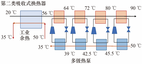熱量變換器的熱量輸入源為循環(huán)水,如果熱量輸出側(cè)也是循環(huán)水,當熱源側(cè)循環(huán)水的平均溫度高于熱匯側(cè)循環(huán)水平均溫度時,可以通過吸收式換熱器實現(xiàn)這一換熱過程。在熱源與熱匯溫差明顯不匹配時,吸收式換熱器可以使熱匯側(cè)獲得最高溫度,在滿足經(jīng)濟性的前提下實現(xiàn)兩側(cè)平均溫度差低至10 K條件時的熱量傳遞。當兩側(cè)平均溫度差<10 K甚至熱匯側(cè)要求的平均溫度高于熱源側(cè)時,需輔以壓縮式熱泵并輸入電力做功以提高熱匯側(cè)的溫度品位。從50/35 ℃的余熱中提取熱量到90/20 ℃的余熱共享循環(huán)水系統(tǒng)中的流程如圖2所示。