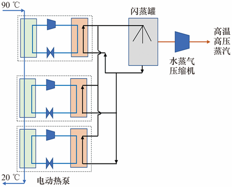 在多數(shù)情景下,工業(yè)生產(chǎn)需要的熱量以蒸汽形式提供,可從90/20 ℃的循環(huán)水中提熱量,通過吸收式換熱器、電動熱泵聯(lián)合工作將熱量變換成為高溫水,再通過閃蒸得到低壓蒸汽,經(jīng)過水蒸氣壓縮機將低壓蒸汽壓縮至所需壓力(見圖3)。按照水蒸氣的焓與凝結(jié)水焓值之差計算蒸汽的熱量,蒸汽的熱量與耗電量之比(等效COP)為3。合理配置多級吸收式換熱、壓縮熱泵的比例,通過多級閃蒸和多級蒸汽壓縮,可進一步減少各級換熱過程的耗散、不同溫度之間摻混的耗散,提高等效COP。
