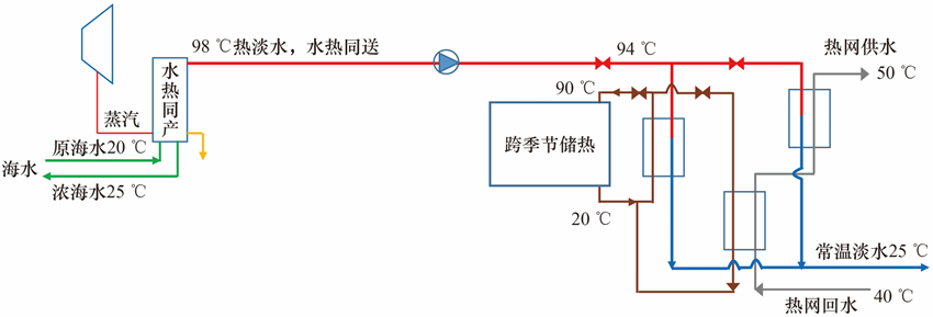 抽取核電低壓蒸汽作為海水淡化的動力,通過多級閃蒸方式制備95 ℃的熱淡水。輸入蒸汽熱量的10%~15%隨海水淡化后得到的濃海水排出,85%~90%的熱量進入熱淡水。當取出的原海水溫度為20 ℃、輸出的熱淡水溫度為95 ℃時,提供1 t蒸汽只需要制備熱淡水6.8~7.2 t,遠低于常規(guī)熱法海水淡化的制水比(12~16)。熱法海水淡化裝置相對簡單,允許有較大的換熱溫差,可降低海水淡化裝備的投資。在非采暖季,熱淡水送至用熱用水末端,與跨季節(jié)儲熱設(shè)施的循環(huán)水換熱,得到常溫淡水用于生活給水;換熱釋放出的熱量進入跨季節(jié)儲熱設(shè)施。在采暖季,熱淡水直接與城市熱網(wǎng)循環(huán)水換熱,冷卻至常溫后進入生活用水;進入寒冷期,增大熱網(wǎng)循環(huán)水流量,部分循環(huán)水與跨季節(jié)儲熱設(shè)施的循環(huán)水換熱,為供暖提供更多的熱量。