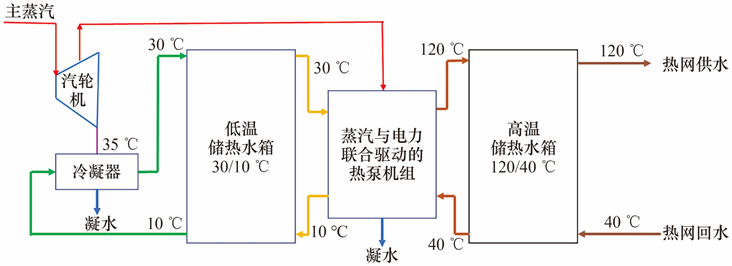 北方地區(qū)目前普遍應(yīng)用的方式是:在冬季負荷高峰期全功率發(fā)電,而在負荷低谷期最大能力地抽汽供熱,通過電鍋爐方式將部分電力轉(zhuǎn)為熱量,進一步減少輸出的電力;抽汽獲得的熱量、電鍋爐制備的熱量在滿足當時的供熱需求外儲存在儲熱水罐,作為電力負荷高峰期的供熱熱源。這一方式使高品位電力轉(zhuǎn)為低品位熱量,造成能量品位的損失,冷凝器排出的冷端余熱也不能有效回收利用,系統(tǒng)的能源轉(zhuǎn)換效率、發(fā)電效率都不高。