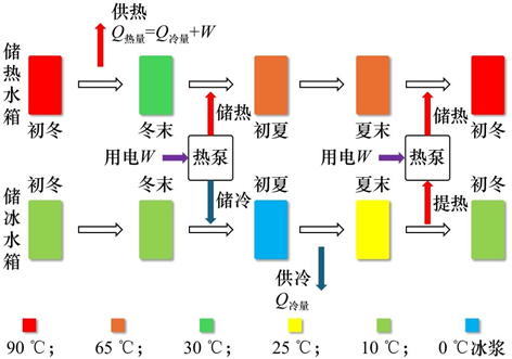 跨季節(jié)儲熱/儲冷原理討論如下。進入冬季,利用蓄熱水箱預(yù)先儲存的90 ℃熱水為建筑供熱,釋放出熱量后成為30 ℃溫水并儲存;采暖結(jié)束后,利用春季的過剩電力將儲冷水箱中15 ℃的冷水制成冰漿,用制冰提取出的熱量加熱蓄熱水箱中的溫水。春季結(jié)束時,儲冷水箱中為含冰量30%~50%的冰漿,儲熱水箱的水溫升至65 ℃。進入夏季,利用儲冷水箱中的冰漿為建筑供冷,釋出冷量后成為25 ℃的溫水。進入秋季,再利用富余的電力通過熱泵將冷水箱中25 ℃的溫水冷卻到10 ℃,提取出的熱量將熱水箱中的熱水由65 ℃升溫至90 ℃。由此實現(xiàn)利用春、秋季的富余電力,將夏季建筑物排出的熱量用于冬季采暖,既可減少冬、夏季采暖空調(diào)的用電量,也能解決冬季建筑采暖缺少熱源的問題。通過這一方式全年獲取的冷/熱量之和與用電總量之比可達5,即使考慮儲熱、儲冷損失,綜合COP>4,優(yōu)于單獨的熱泵制熱、制冷表現(xiàn)。