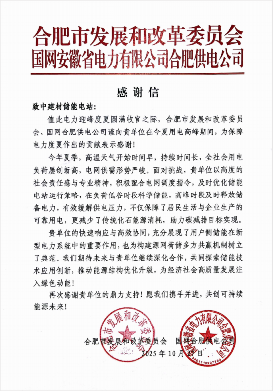 該項(xiàng)目在迎峰度夏期間的穩(wěn)定運(yùn)行,有力證明了用戶側(cè)儲(chǔ)能的巨大價(jià)值,同時(shí)彰顯了中材海外在儲(chǔ)能系統(tǒng)集成、智慧運(yùn)維與電網(wǎng)協(xié)同方面的綜合能力。合肥市發(fā)改委與供電公司在信中特別指出,中材海外“展現(xiàn)了用戶側(cè)儲(chǔ)能在新型電力系統(tǒng)中的重要作用”,并期待未來在儲(chǔ)能技術(shù)創(chuàng)新與應(yīng)用場(chǎng)景拓展方面繼續(xù)深化合作。