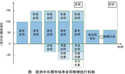 從物理執(zhí)行的角度,電力市場(chǎng)只有現(xiàn)貨市場(chǎng),沒有中長期市場(chǎng);中長期市場(chǎng)只是服務(wù)于電力現(xiàn)貨市場(chǎng)價(jià)格風(fēng)險(xiǎn)管理的配套市場(chǎng)。由于這個(gè)原因,國外電力市場(chǎng)一般就是指現(xiàn)貨市場(chǎng)。美國電力市場(chǎng)主要是日前市場(chǎng)和實(shí)時(shí)市場(chǎng),專門用于現(xiàn)貨市場(chǎng)價(jià)格風(fēng)險(xiǎn)管理的電力金融市場(chǎng)完全由專門金融機(jī)構(gòu)組織,不納入電力市場(chǎng)范圍。歐洲統(tǒng)一電力市場(chǎng)雖然有中長期市場(chǎng),甚至統(tǒng)計(jì)的交易電量規(guī)?;虮壤容^大,但是這個(gè)市場(chǎng)其實(shí)主要也是金融性的,即用于市場(chǎng)經(jīng)營主體通過套利機(jī)制規(guī)避現(xiàn)貨市場(chǎng)價(jià)格風(fēng)險(xiǎn),而不是物理執(zhí)行。如圖所示,在歐洲統(tǒng)一電力市場(chǎng)中,市場(chǎng)經(jīng)營主體可開展多年、年度、月度中長期交易合同,中長期合同與日前合同、日內(nèi)合同形成的凈合同才物理執(zhí)行。表面上看好像與目前我國電力市場(chǎng)相似,實(shí)際上,由于市場(chǎng)經(jīng)營主體可以超過發(fā)用電能力和反向申報(bào)(即發(fā)電企業(yè)可申報(bào)用電合同等),歐洲中長期市場(chǎng)具有非常明顯的金融性,即通過不同周期、不同地區(qū)和不同市場(chǎng)體系之間的套利機(jī)制,使各種市場(chǎng)的交易價(jià)格趨于一致,市場(chǎng)經(jīng)營主體規(guī)避了價(jià)格風(fēng)險(xiǎn)。