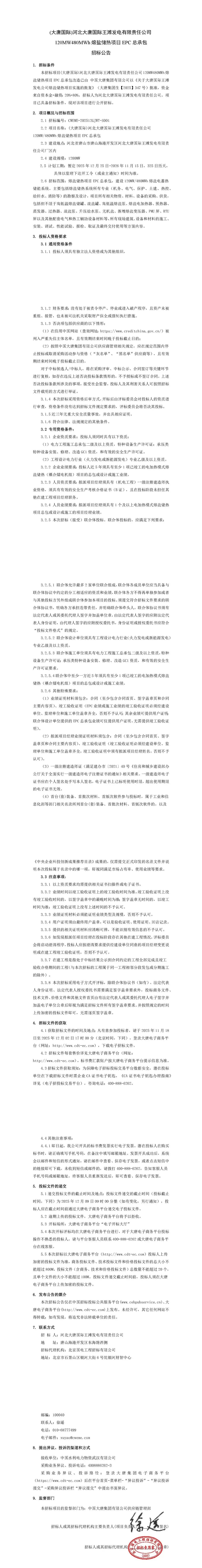 招標(biāo)范圍:熔鹽儲熱項目EPC總承包,建設(shè)120MW/480MWh熔鹽電蓄熱儲能系統(tǒng)。