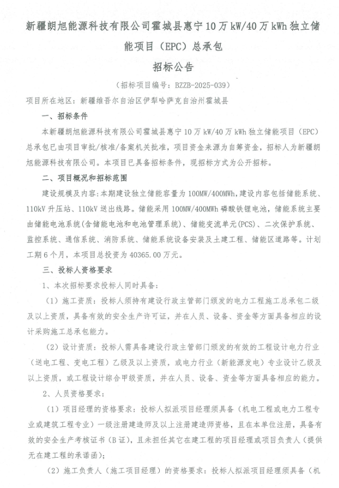 中國儲能網(wǎng)訊:11月21日,新疆朗旭能源科技有限公司霍城縣惠寧10萬kW/40萬kWh獨立儲能項目(EPC)總承包招標公告發(fā)布,項目招標人為新疆朗旭能源科技有限公司,項目位于新疆維吾爾自治區(qū)伊犁哈薩克自治州霍城縣,本期建設獨立儲能容量為100MW/400MWh,建設內容包括儲能系統(tǒng)110kV 升壓站、110kV 送出線路。